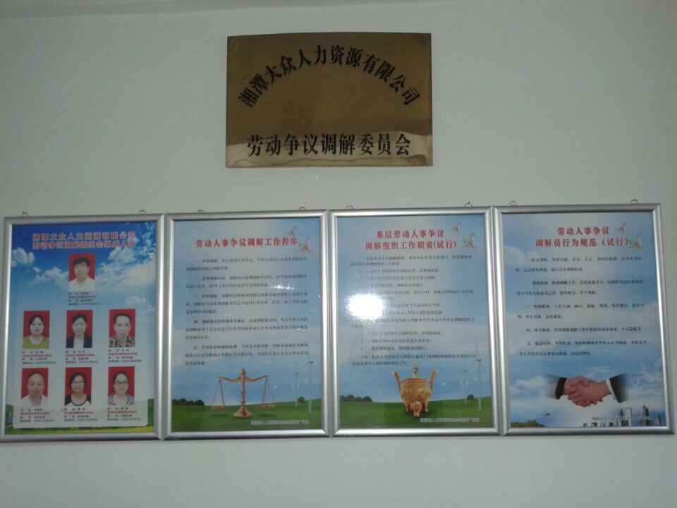 為了規(guī)范勞動人事爭議預(yù)防調(diào)解處理工作,維護(hù)社會和諧穩(wěn)定,按照潭人社發(fā)【2014】29號文件要求,根據(jù)《中華人民共和國勞動爭議調(diào)解仲裁法》等法律法規(guī)精神,湘潭大眾人力資源有限公司于2014年6月13日調(diào)整規(guī)范了勞動爭議調(diào)解委員會,并對委員會成員、工作程序、工作職責(zé)、行為規(guī)范進(jìn)行了上墻公示。